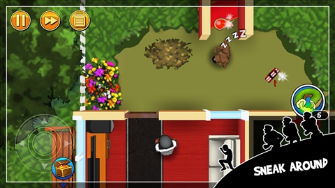 游戏故事背景是Bob在神秘男帮助下越狱,然后开始为神秘男工作,Bob需要避开房屋主人,盗取目标物品,从安全出口带出才能完成关卡。游戏有四种不同的游戏场景,而关卡选择看起来很像是EA的间谍鼠,每一幢楼房就是一个关,玩家点击后Bob会死命的跑动,恶趣味的小编不断点击让Bob来了个5000米。
