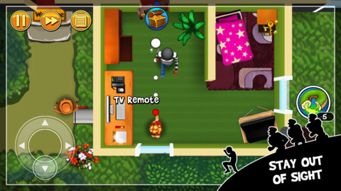 和间谍鼠的区别主要体现在操作方式上,本作采用的是大家熟悉的虚拟摇杆搭配动作按键的,方便上手,反应速度一般。摇杆是可以自由拖动的,而右下角的加速键也会随之自动排列,方便不同玩家的用手习惯。而加速键可以让Bob加速移动,不过也会发出更大的响动,引起屋主的注意,加速会消
