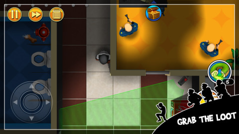 游戏采用摇杆操作,左手控制方向,右手控制快走和 Ninja 隐身(很少用到),每一关中,需要偷的东西都会闪闪发光。咱们并不需要偷光所有东西才能通关,最核心的东西会有宝箱的标识,偷完就可以走人。
